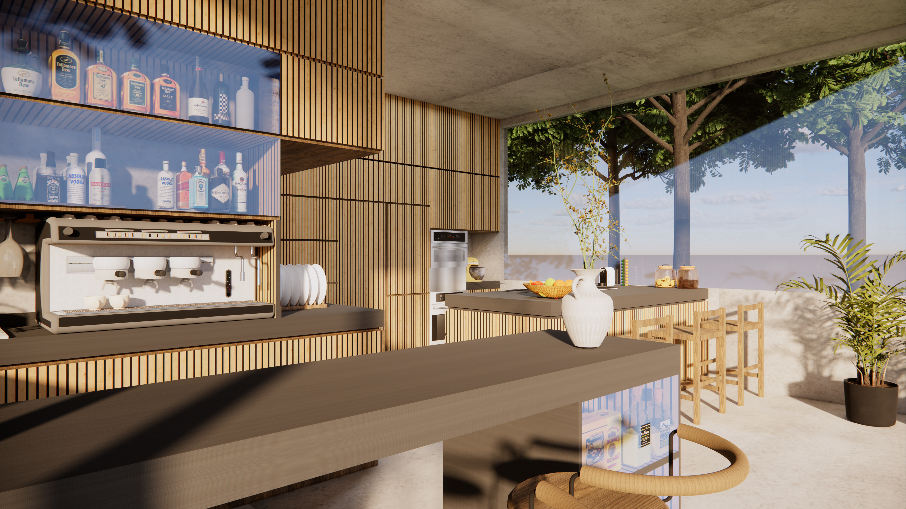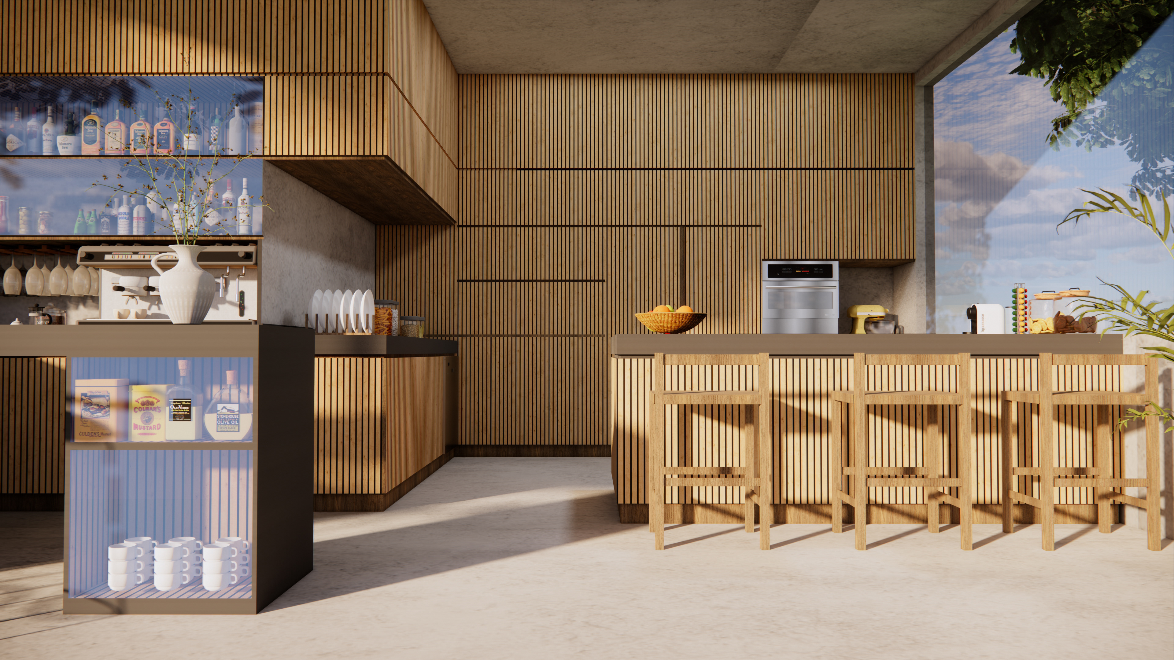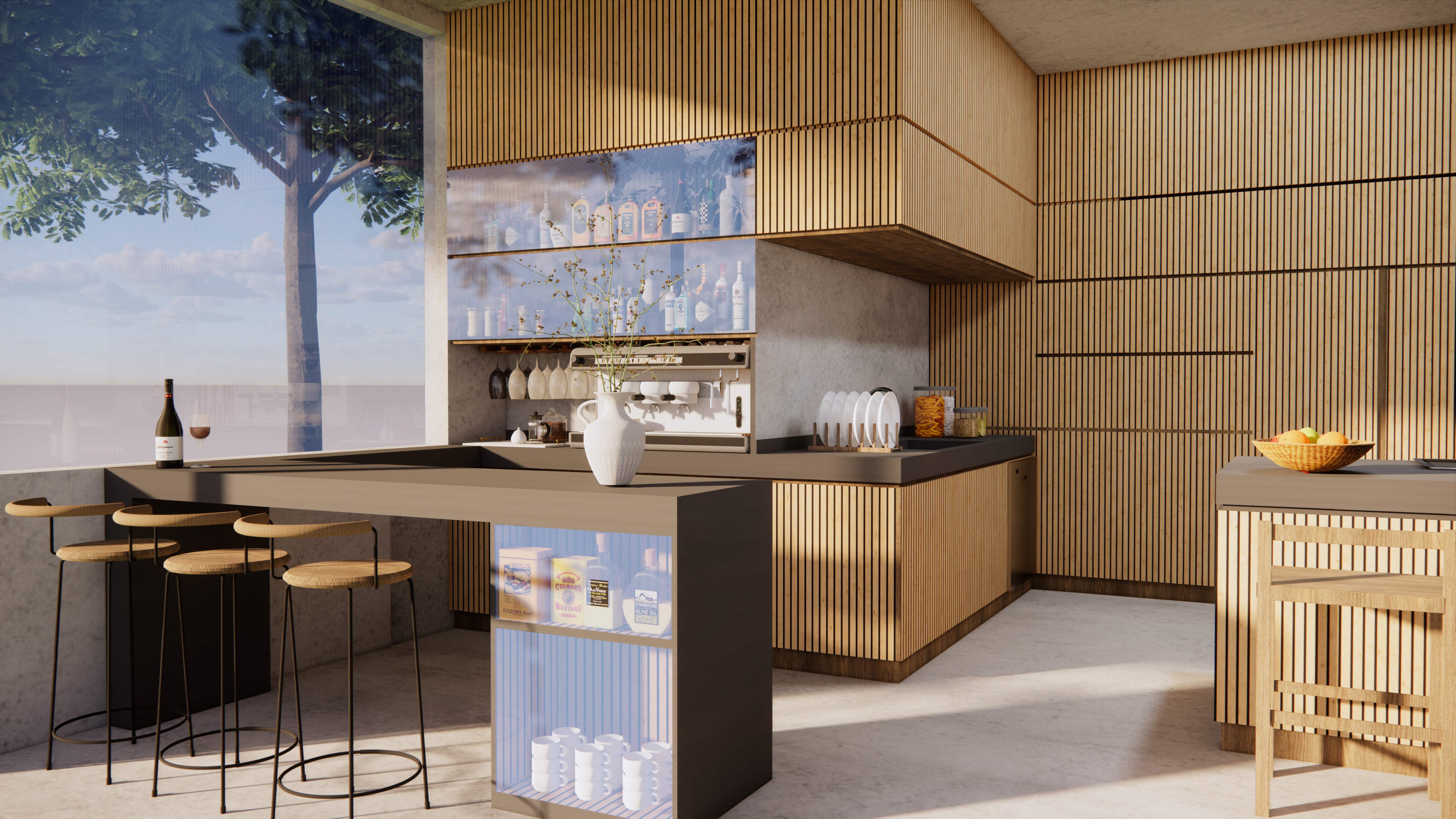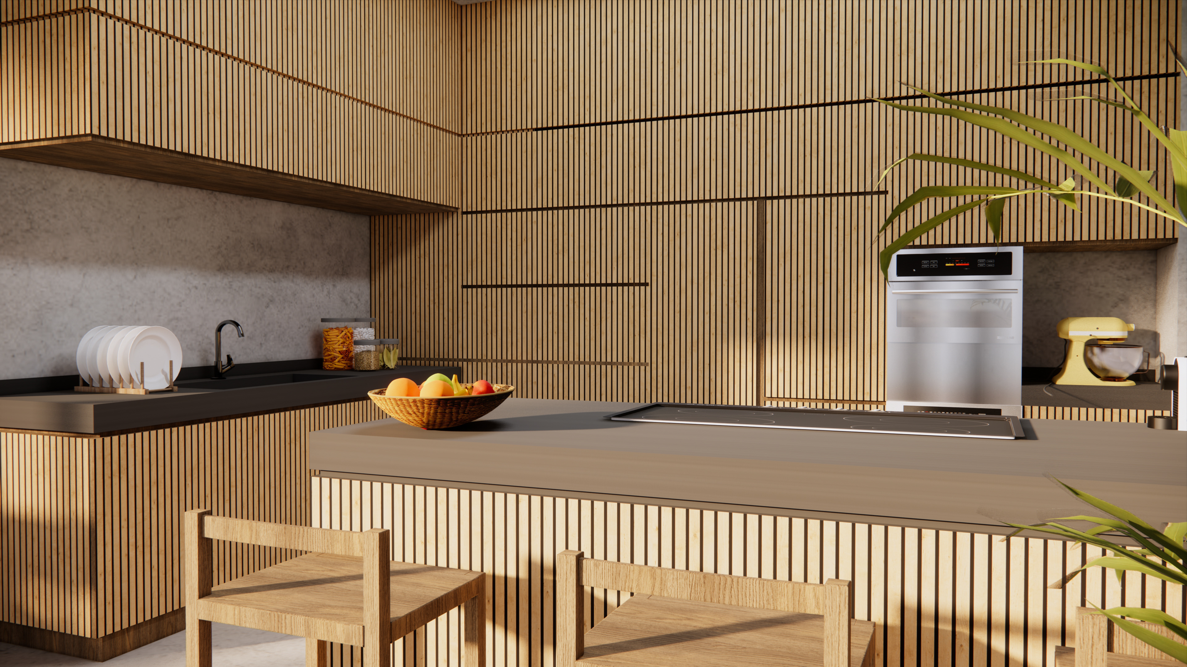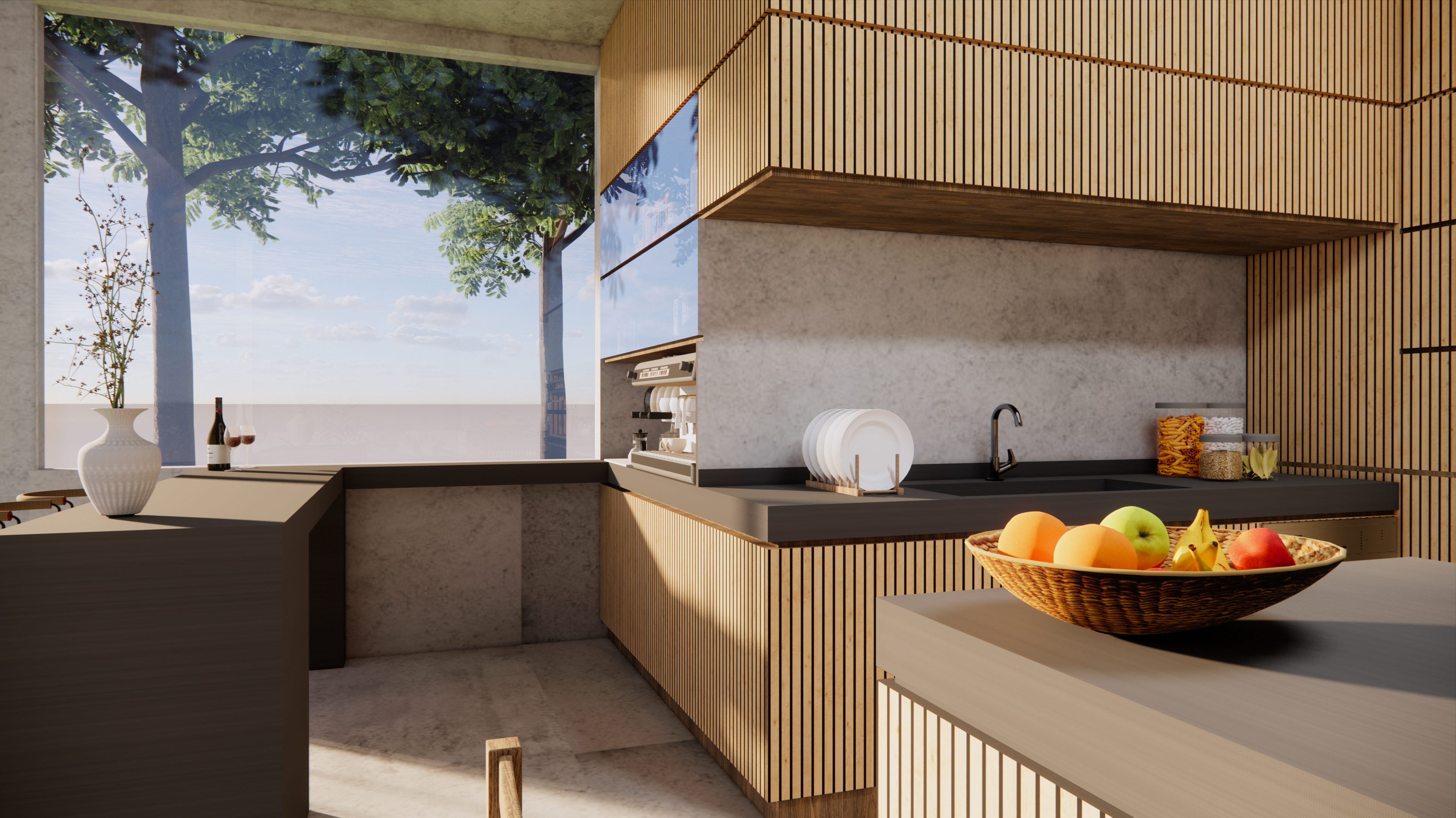 This project explores a modern kitchen concept that merges functionality with organic warmth. Using vertical oak slats, smart lacquer countertops, and expansive glass panels, the design emphasizes clean lines, natural textures, and openness to the surrounding landscape. Minimalist detailing and integrated appliances enhance the sleek aesthetic, while thoughtful lighting and soft tonal contrasts create a welcoming, contemporary atmosphere. The space is designed to be both a social hub and a serene retreat, seamlessly blending indoor comfort with outdoor inspiration.